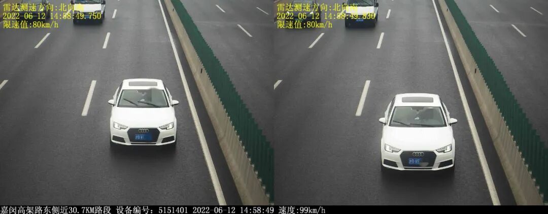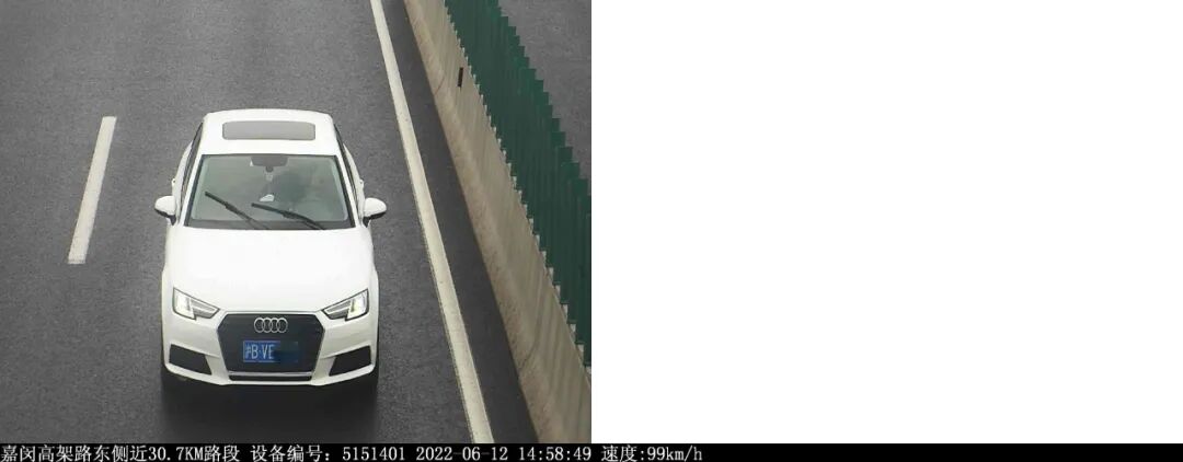 ▲2022年6月12日14时58分,号牌为沪BVE***的小型轿车在嘉闵高架路东侧近30.7KM路段,实施了“驾驶校车、中型以上载客载货汽车、危险物品运输车辆以外的机动车在城市快速路上行驶超过规定时速20%以上未达到50%的”违法行为,该车车速99km/h,限速80km/h。