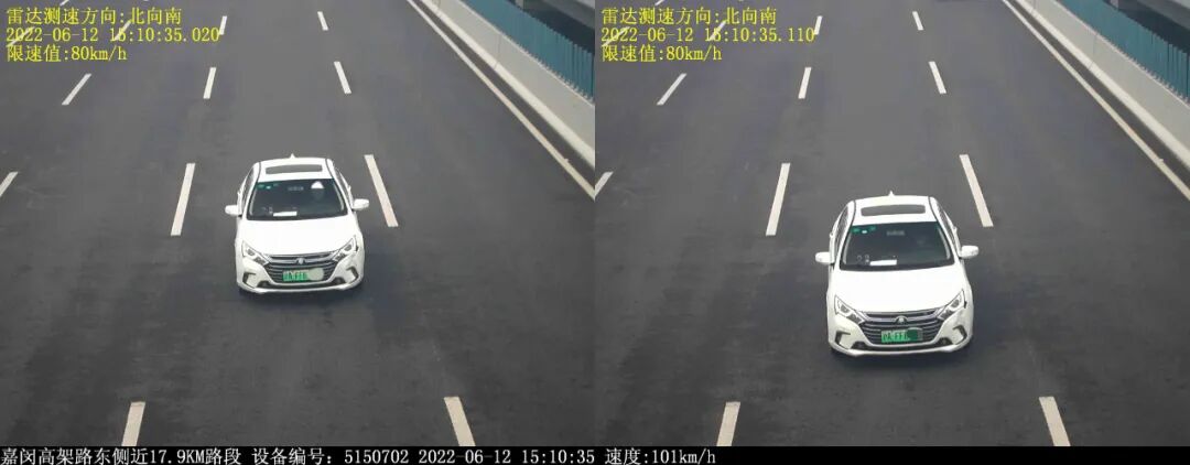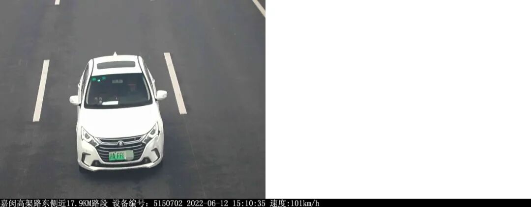 ▲2022年6月12日15时10分,号牌为沪AFF8***的小型轿车在嘉闵高架路东侧近17.9KM路段,实施了“驾驶校车、中型以上载客载货汽车、危险物品运输车辆以外的机动车在城市快速路上行驶超过规定时速20%以上未达到50%的”违法行为,该车车速101km/h,限速80km/h。