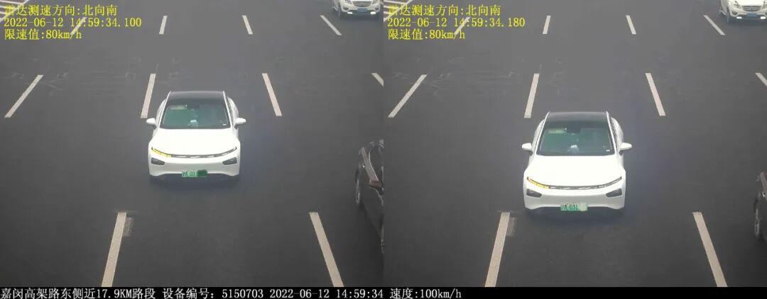 ▲2022年6月12日14时59分,号牌为沪AD31***的小型轿车在嘉闵高架路东侧近17.9KM路段,实施了“驾驶校车、中型以上载客载货汽车、危险物品运输车辆以外的机动车在城市快速路上行驶超过规定时速20%以上未达到50%的”违法行为,该车车速100km/h,限速80km/h。