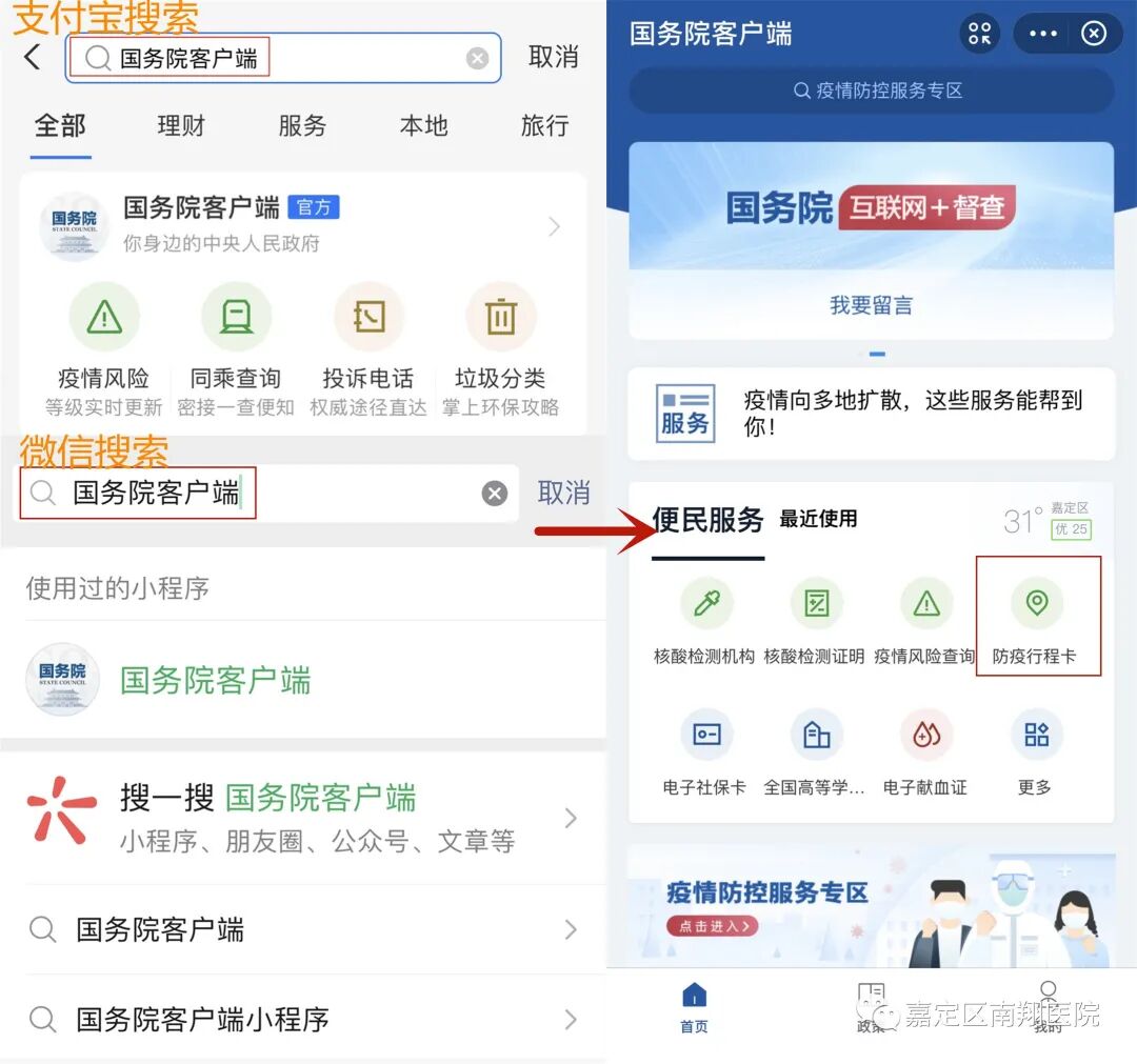 ① 打开“支付宝”或“微信”直接搜索“国务院客户端”,进入后点击“防疫行程卡”查询;