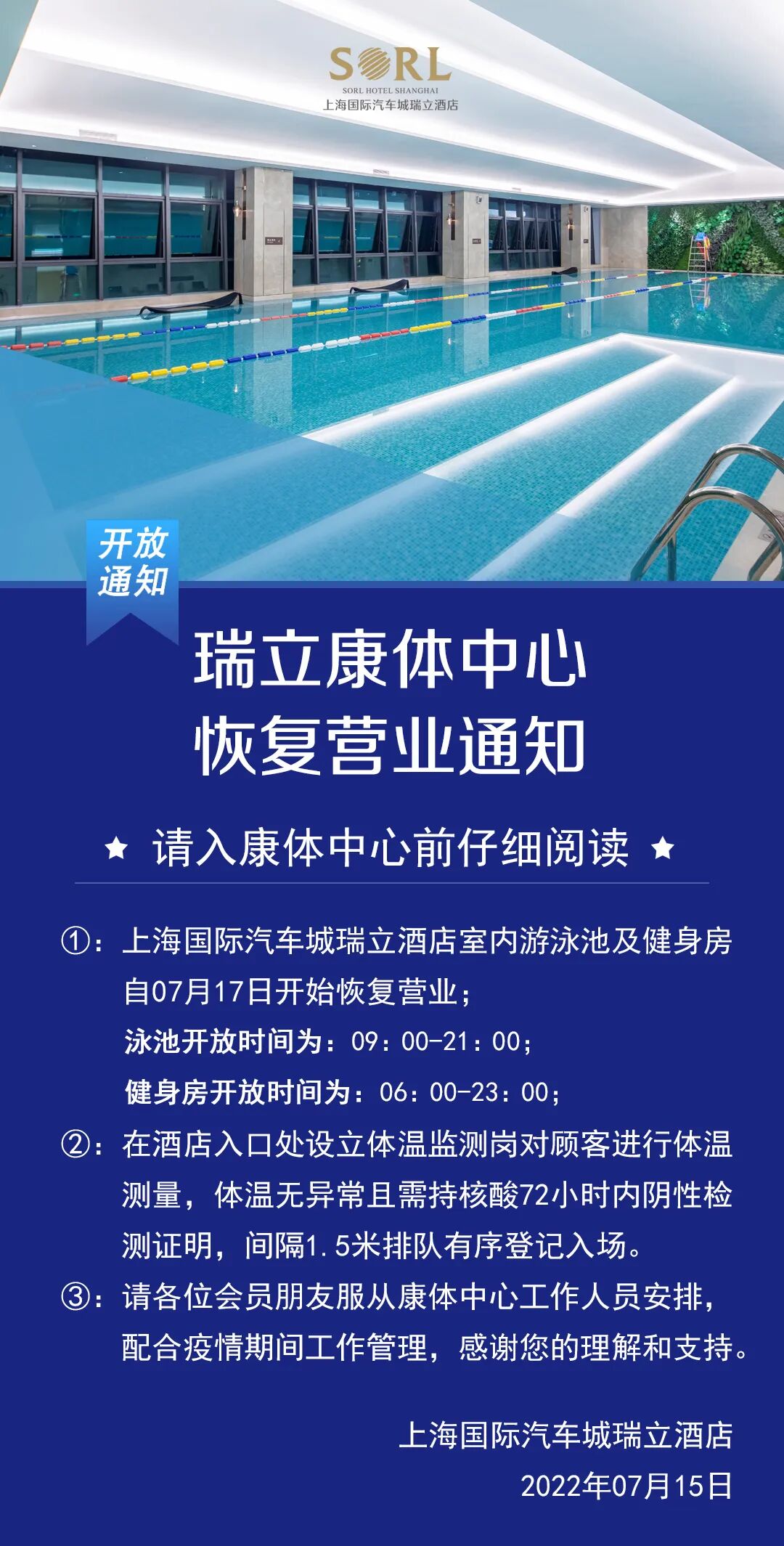 位于嘉定安亭汽车城的地标建筑——瑞立酒店也传来好消息,酒店的游泳池和健身房将于7月17日恢复营业!
