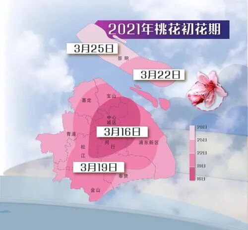 今年上海的桃始华,要到下周才逐渐开始。预计上海桃树初花期为3月16日-28日。市区、松江、闵行和浦东新区北部为3月16日-20日;浦东新区(新场、惠南和大团)、宝山、青浦和嘉定为3月18日-23日;金山、奉贤和崇明为3月21日-28日。盛花期在初花后5天左右。
