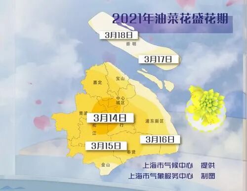 根据上海市气候中心的预测,今年油菜花的盛花期在3月14-18日。中西部郊区,如闵行、嘉定、青浦、松江等稍早一些在3月14-15日进入盛花期,而北部和东部郊区就会晚一些,如崇明,是在17-18日逐渐盛开。
