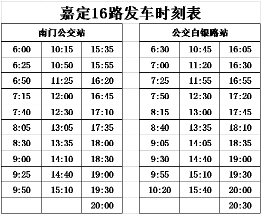 自6月15日首班车起,嘉定16路首末班车时间变更、时刻表调整。