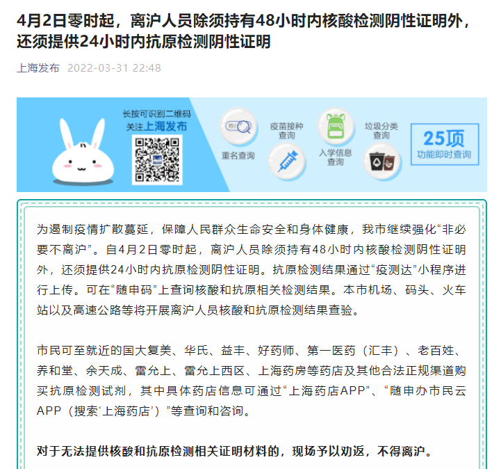 为遏制疫情扩散蔓延,保障人民群众生命安全和身体健康,上海市继续强化“非必要不离沪”。自4月2日零时起,离沪人员除须持有48小时内核酸检测阴性证明外,还须提供24小时内抗原检测阴性证明。抗原检测结果通过“疫测达”小程序进行上传。可在“随申码”上查询核酸和抗原相关检测结果。上海市机场、码头、火车站以及高速公路等将开展离沪人员核酸和抗原检测结果查验。   市民可至就近的国大复美、华氏、益丰、好药师、第一医药(汇丰)、老百姓、养和堂、余天成、雷允上、雷允上西区、上海药房等药店及其他合法正规渠道购买抗原检测试剂,其中具体药店信息可通过“上海药店APP”、“随申办市民云APP(搜索‘上海药店’)”等查询和咨询。   对于无法提供核酸和抗原检测相关证明材料的,现场予以劝返,不得离沪。   后续将根据疫情发展和防控要求,动态调整相关措施。