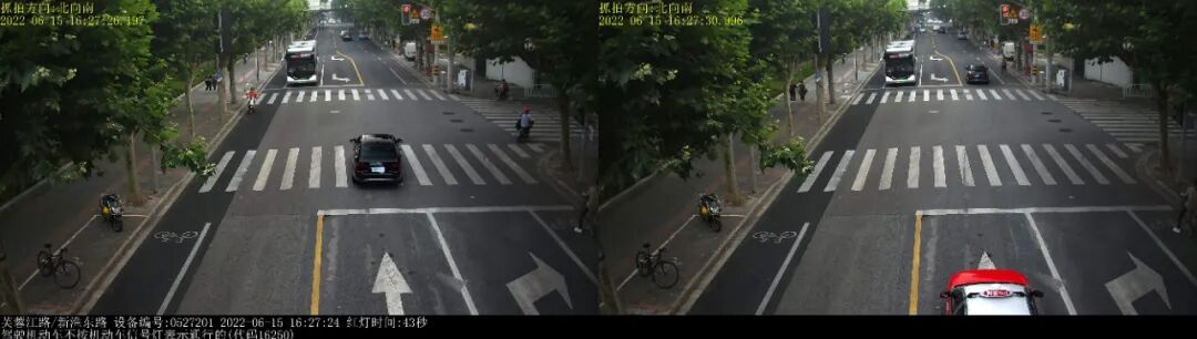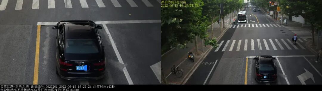 ▲2022年6月15日16时27分,号牌为沪DTA***的小型轿车在芙蓉江路新渔东路,实施了“驾驶机动车不按机动车信号灯表示通行的”违法行为。