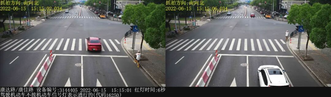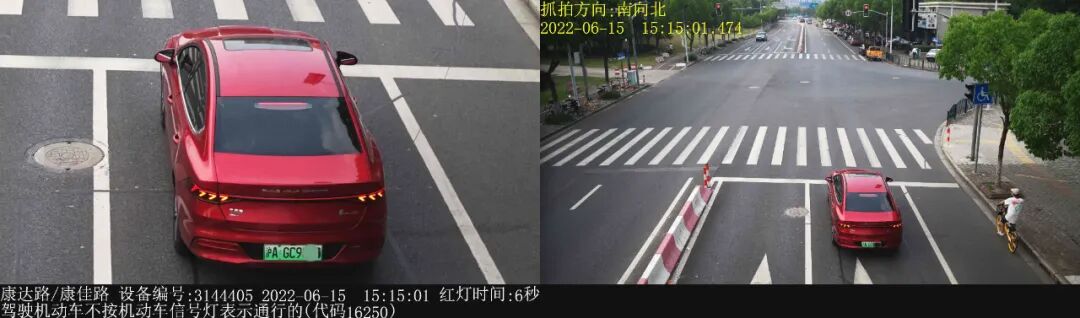 ▲2022年6月15日15时15分,号牌为沪AGC9***的小型轿车在康达路康佳路,实施了“驾驶机动车不按机动车信号灯表示通行的”违法行为。