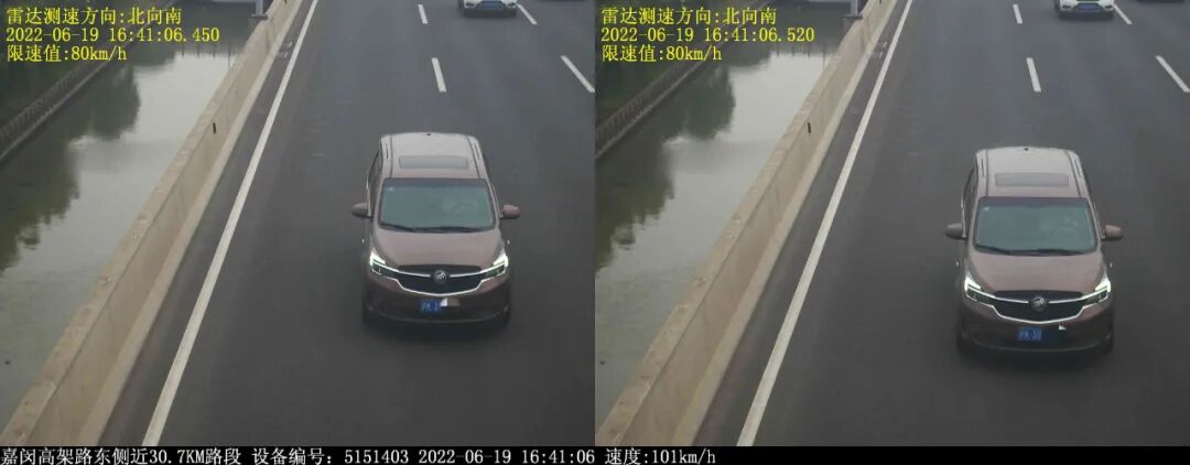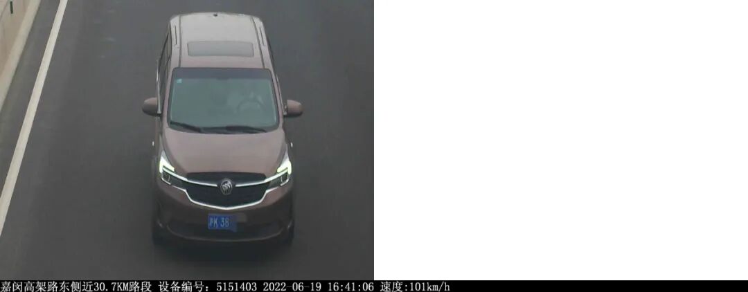 ▲2022年6月19日16时41分,号牌为沪K38***的小型普通客车在嘉闵高架路东侧近30.7KM路段,实施了“驾驶校车、中型以上载客载货汽车、危险物品运输车辆以外的机动车在城市快速路上行驶超过规定时速20%以上未达到50%的”违法行为,该车车速101km/h,限速80km/h。