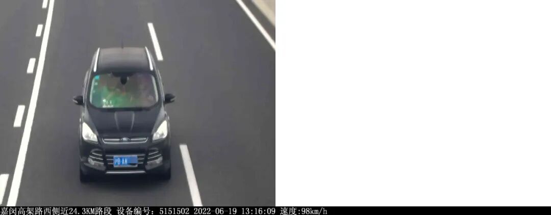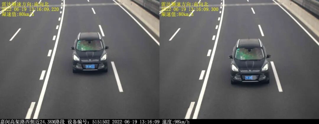 ▲2022年6月19日13时16分,号牌为沪BAW***的小型普通客车在嘉闵高架路西侧近24.3KM路段,实施了“驾驶校车、中型以上载客载货汽车、危险物品运输车辆以外的机动车在城市快速路上行驶超过规定时速20%以上未达到50%的”违法行为,该车车速98km/h,限速80km/h。