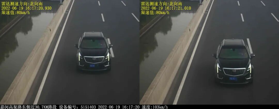 ▲2022年6月19日16时17分,号牌为沪A92***的小型普通客车在嘉闵高架路东侧近30.7KM路段,实施了“驾驶校车、中型以上载客载货汽车、危险物品运输车辆以外的机动车在城市快速路上行驶超过规定时速20%以上未达到50%的”违法行为,该车车速103km/h,限速80km/h。