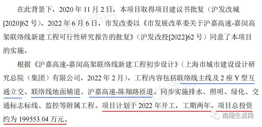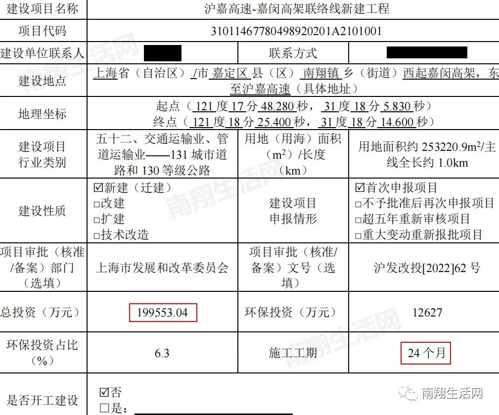 南翔生活网根据拿到的《沪嘉高速-嘉闵高架联络线新建工程环境影响报告表(报批稿公示版)》注意到,最大的亮点是,根据这份报告,该项目计划于 2022年开工,工期两年。项目总投资约为199553.04万元。(注:以实际建设为准)