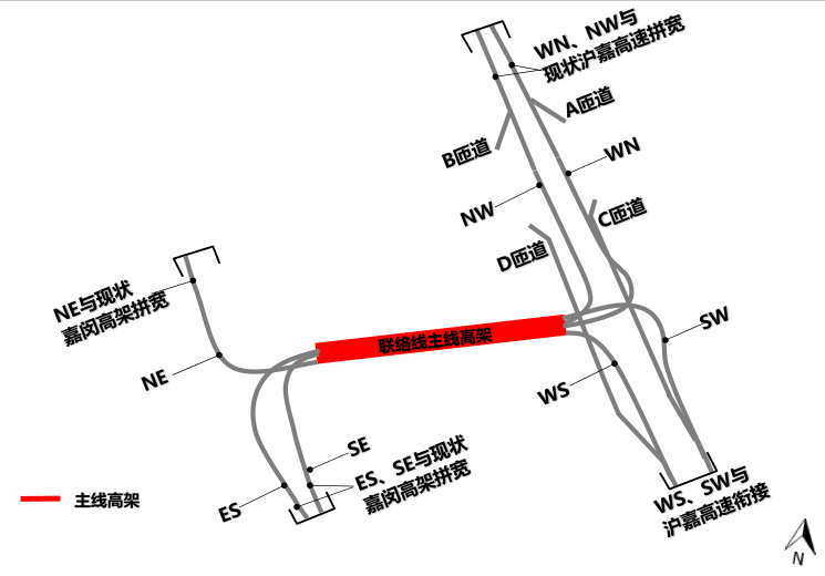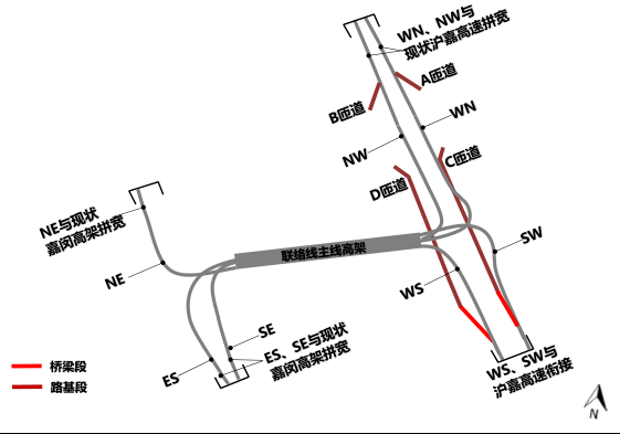 1、联络线主线高架 联络线主线高架西起嘉闵高架,东至沪嘉高速,全线以高架桥梁形式贯通始终,东西走向,基本沿用现状真南路-尚仁路线位,全长约458m。设计标准按照城市快速路,双向6车道,设计车速60km/h。       2、联络线-沪嘉高速立交 联络线-沪嘉高速立交位于联络线主线高架东侧,为1座Y型互通立交,包括4根匝道,分别为WN、NW、SW、WS,匝道单向双车道,宽8.5m,设计车速40km/h。其中,SW、WS匝道均为桥梁形式;WN、NW由桥梁和路基两种形式组成。桥梁部分为匝道段,路基部分为匝道段和拼宽段。(SW、WS两根匝道向南和沪嘉高速抬升工程相衔接(沪嘉高速抬升工程尚未立项,本次不评价))     联络线-沪嘉高速立交工程区域空间呈上下4层布置。其中,联络线地面辅道为第 1层;沪嘉高速主线和轨道交通11号线位于第2层;NW、WN、WS匝道上跨11号线后接沪嘉高速,位于第3层;SW匝道上跨11号线及WN、NW匝道后,向下接沪嘉高速,位于第4层。     3、联络线-嘉闵高架立交 联络线-嘉闵高架立交位于联络线主线高架西侧,为1座Y型互通立交,包括3根匝道,分别为ES、SE、NE,匝道单向双车道,宽8.5m,设计车速40km/h。3根匝道均为桥梁形式,与嘉闵高架拼宽。为避让污染土地块,EN匝道本次不实施,仅预留跳水台。     联络线-嘉闵高架立交工程区域空间上呈上下4层布置。其中,联络线地面辅道、沪宜公路为第1层;现状嘉闵高架和SE匝道位于第2层;ES匝道上跨嘉闵高架位于3层;NE匝道上跨嘉闵高架、SE匝道及ES匝道位于4层。