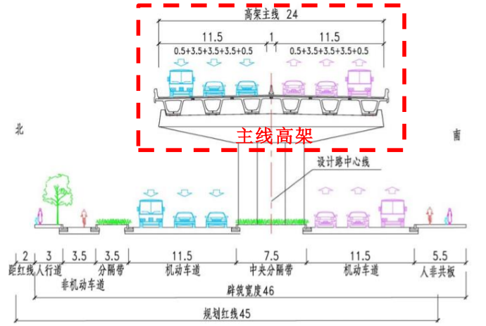 联络线地面辅道为改建工程,西起沪宜公路,东至沪嘉高速,全长约1037m,规划道路红线45-53m,二级公路,双向6车道,设计车速60km/h。
