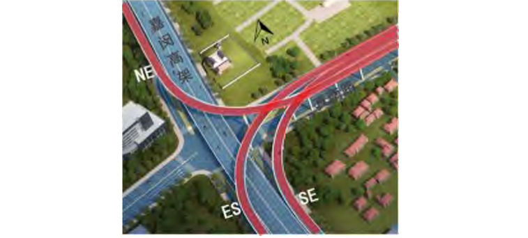 本次同步实施上下沪嘉高速的2对陈翔路匝道,分别为A、B、C、D。四根匝道均为单向双车道,宽8.5m,设计车速40km/h。其中,A、B两根匝道位于陈翔公路北侧,为地面形式,与现状沪嘉高速路基形式相衔接;C、D两根匝道位于陈翔公路南侧,为路基和桥梁两种形式,与远期沪嘉高速相衔接。
