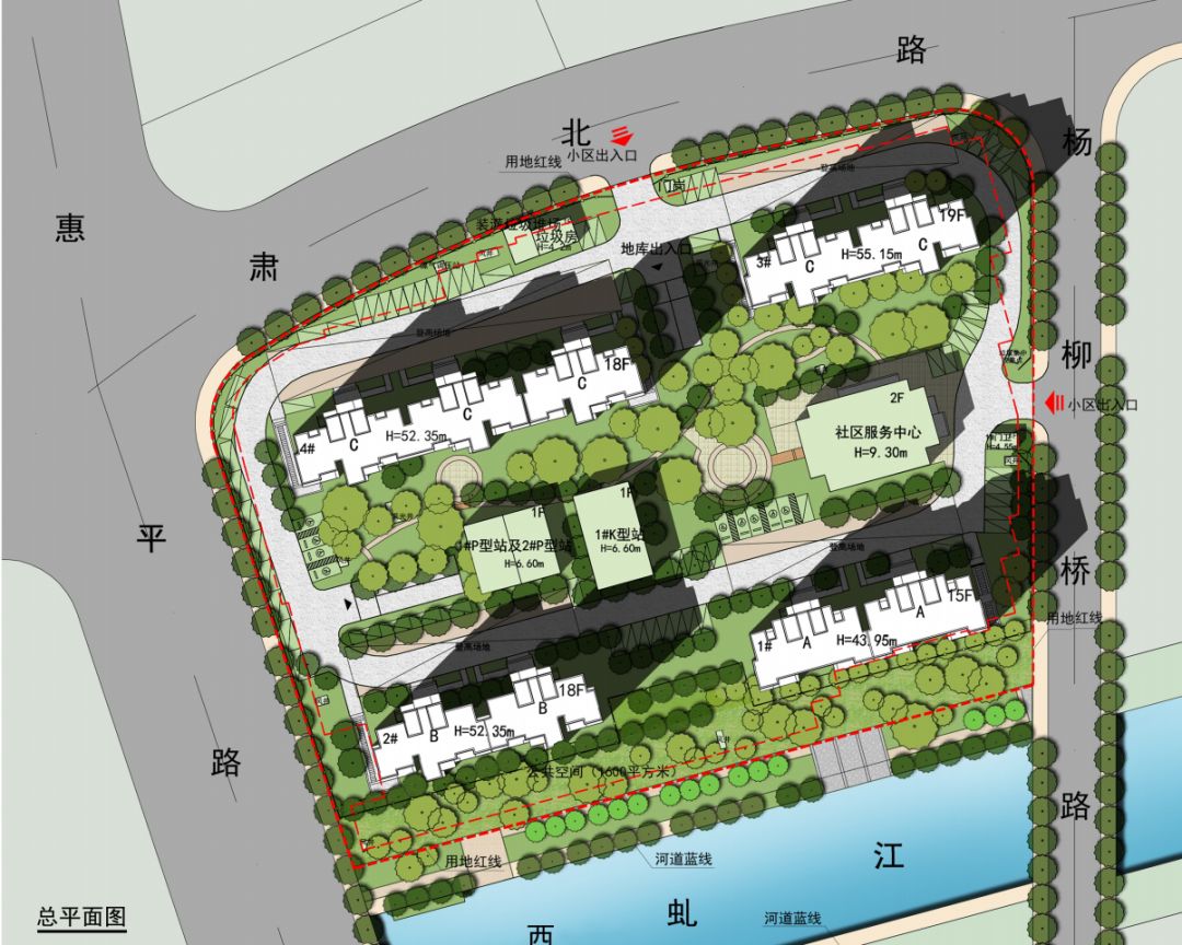 主要为 19、18、15 层的高层住宅, 设有一个地下车库, 设置一个社区服务中心, 用地性质为动迁安置房及配套设施。