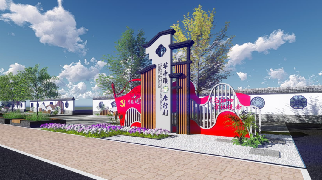 将嘉行公路红线外拆违后的空置区,按照村民休闲和宣传展示的两大功能定位,新建标识标牌、广场、景石小品、步道、座椅、宣传栏、景观灯、绿化种植等,美化空地,减少乱停车现象,补充村庄公共区域设施。休闲区通过设置座椅,再现村口村民围坐聊天的生活场景,成为小型的村民“会客厅”;宣传区融入党建、村史等元素,弘扬社会主义核心价值观,传承集镇记忆与文化。