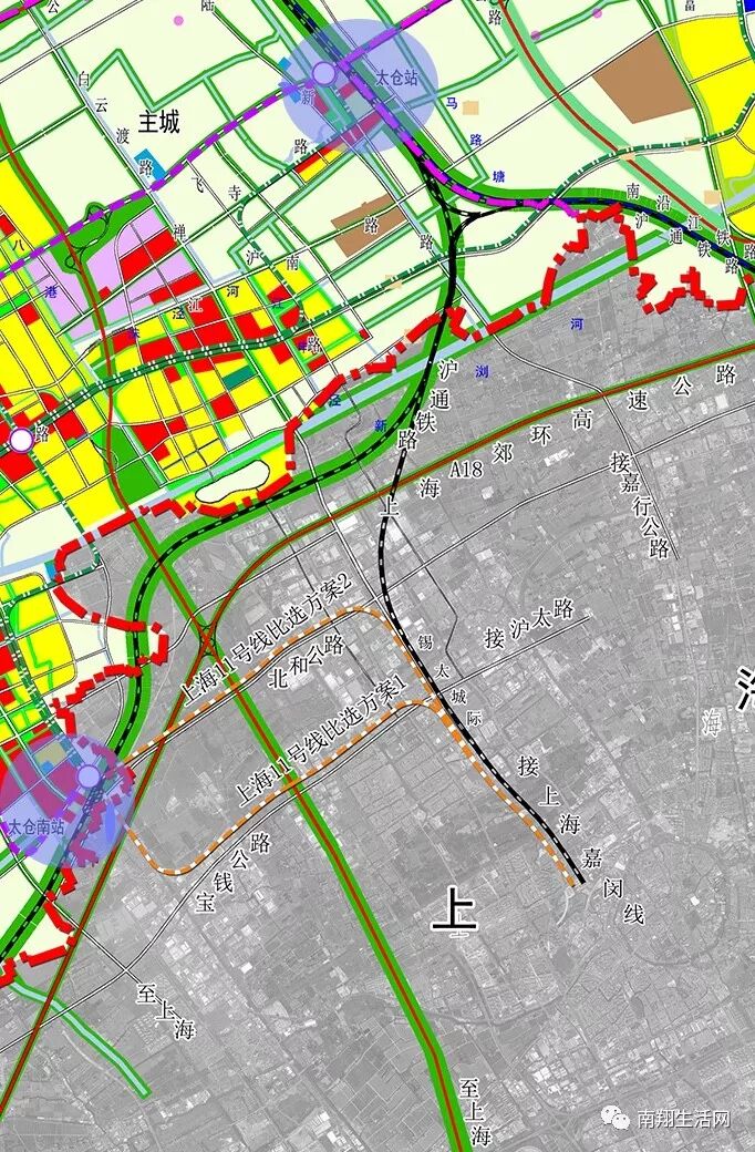 嘉闵线北延段具体走向首次官方公开是2018年发布的《太仓市城市总体规划(2010-2030)》,其中规划图中首次曝光了嘉闵线北延太仓段走向(下图所示)