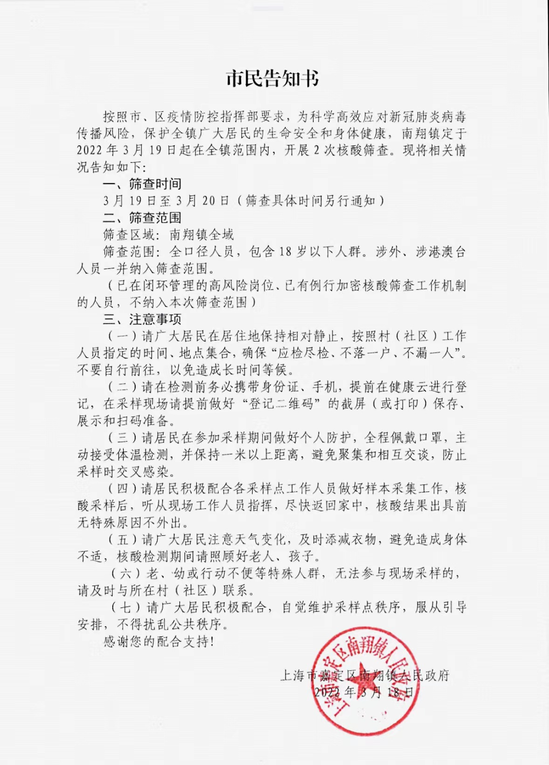 按照市、区疫情防控指挥部要求,为科学高效应对新冠肺炎病毒传播风险,保护全镇广大居民的生命安全和身体健康,南翔镇定于2022年3月19日起在全镇范围内,开展2次核酸筛查。