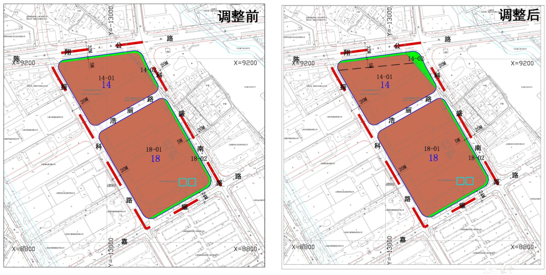 一、规划范围 本次涉及调整的14、18街坊,四至边界:东至科盛南路、南至嘉耀路、西至振科路、北至陈翔公路,用地面积约7.55公顷。   本次局部调整主要涉及14-01、14-02、18-01地块。     二、局部调整背景 《嘉定区南翔东部工业园区JDC2-0401单元控制性详细规划》经“沪府规(2014)56号”批复。   根据企业发展需求,为推进厂区扩容与产业升级,高效利用土地资源,拟提高工业用地的容积率和建筑高度;并适当调整14街坊内工业用地和公共绿地的用地范围,为下一步的开发建设提出合理化的建议。   三、局部调整内容 主要调整内容为: (1)14-01地块:用地性质仍为一类工业用地,用地面积由21172平方米调整为20328平方米,容积率由2.0调整为25,建筑高度由30米调整为40米 (2)18-01地块:用地性质仍为一类工业用地,用地面积仍为35090平方米,容积率由2.0调整为2.5,建筑高度由30米调整为40米; (3)14-02地块:用地性质仍为公共绿地,用地面积由1283平方米调整为2127平方米。