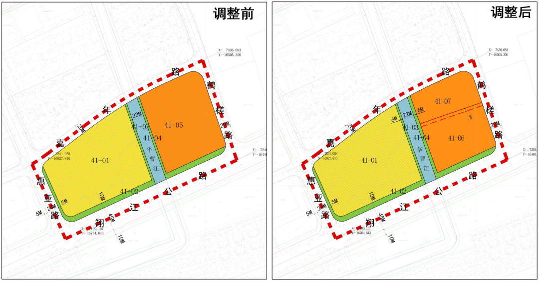 本次涉及调整的41街坊,四至边界:东至鹤槎路,南至翔江公路,西至惠亚路,北至嘉年路,用地总面积约6.74公顷